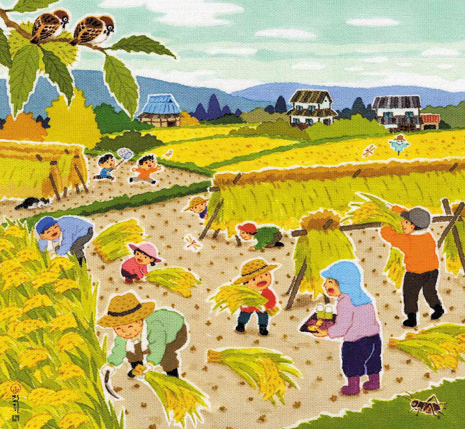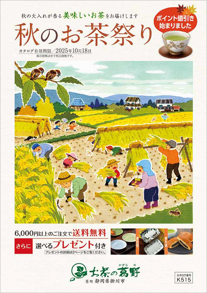 お茶の葛野様カタログ表紙イラスト・秋のお茶祭り号は「稲刈りのお手伝い」です。