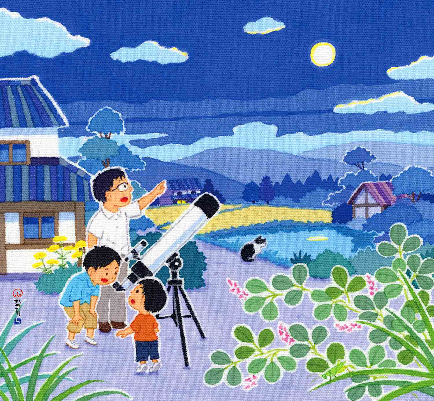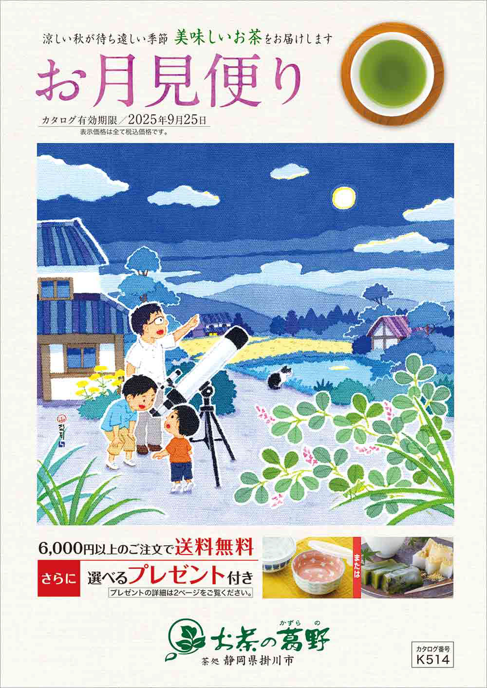 お茶の葛野様カタログ表紙イラスト・ひまわり便りは「お月様の観測」です。